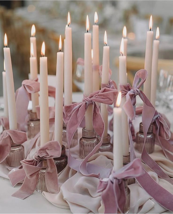 Als finishing touch kun je linten toevoegen aan kaarsen, kalligrafie op naamkaartjes gebruiken of een takje lavendel op de servetten leggen. Kleine, bewuste accenten die de tafel niet overvol maken, maar juist samenhang en verfijning brengen.