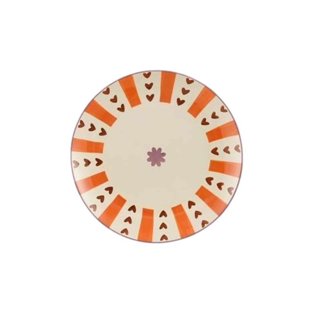 Dit ontbijtbord in oranje met hartjesprint is perfect voor wie op zoek is naar gekleurd servies voor een 21 diner of event. De warme kleur en speelse print geven je tafel direct een levendige en stijlvolle uitstraling.