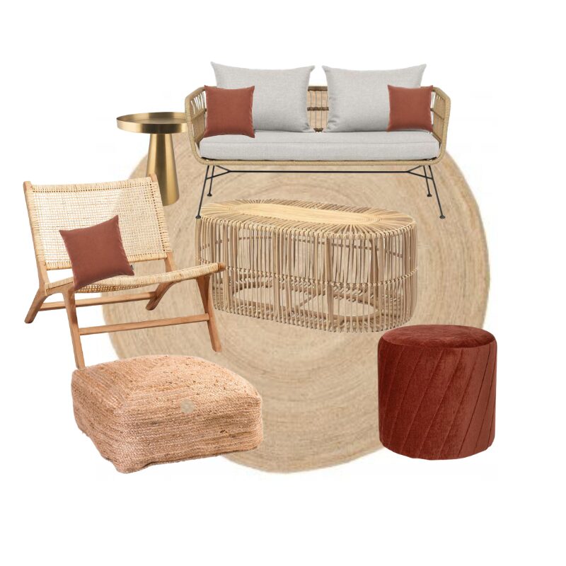 De rotan bank en loungestoel uit de Riva collectie vormen samen met de naturel ovale salontafel een rustige en tijdloze basis. Het sisal vloerkleed, de terracotta poef en de kussens in terracotta- en roesttinten zorgen voor een warme, uitnodigende uitstraling. De gouden bijzettafel Aimee voegt een subtiel chic detail toe.