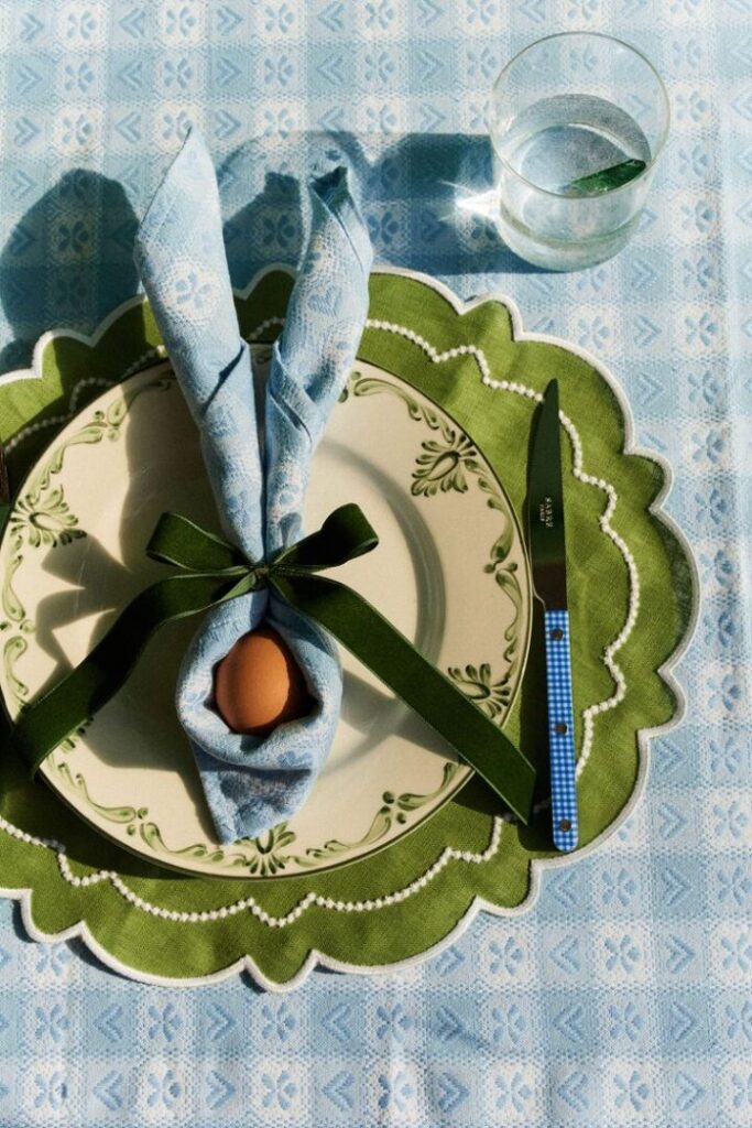 Servetten zijn niet alleen praktisch, ze zijn dé finishing touch voor je Paastafel! In plaats van de standaard vouw, kun je eens iets anders proberen. Denk aan een luchtige, nonchalante stijl die past bij de frisse vibe van Pasen, zoals een eenvoudige “flowy” knoop die het gevoel van lente uitstraalt. Linnen servetten zijn perfect voor deze look – ze geven een chique, maar casual uitstraling.